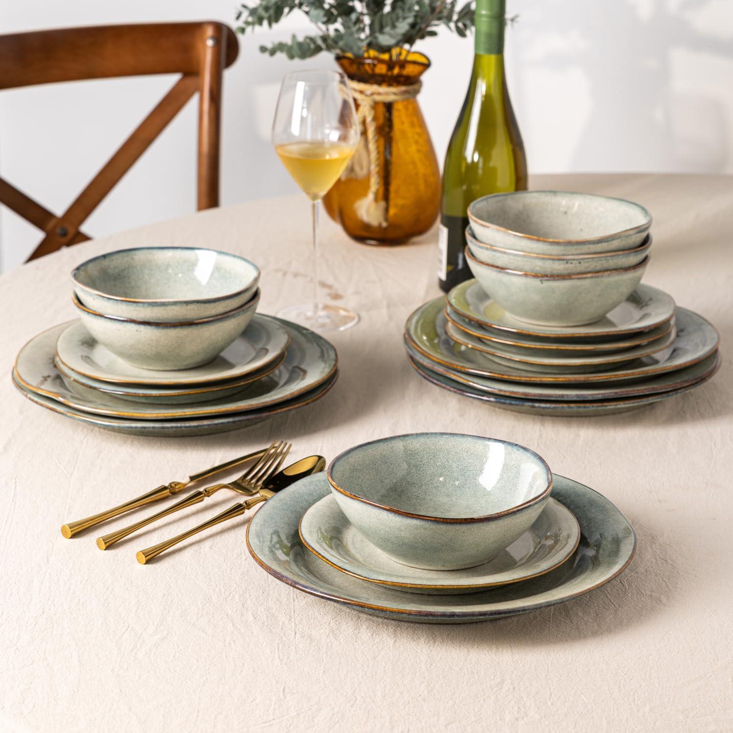 HANDMADE AND MULTI-PURPOSE: Our 12-piece ceramic dinnerware set is handmade with a unique reactive glaze and gently undulating edges, offering a charming, artisanal feel. You can stack and nestle them nicely in your cupboard or on your shelves. Our Dinnerware set is microwave, dishwasher, and freezer safe, Perfect for everyday use, indoors or out, and ideal for any kitchen. It makes your food look even more delicious and makes you happy every day.